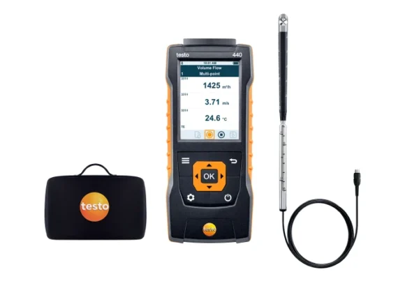 El medidor para climatización testo 440 y la sonda de molinete (Ø 16 mm) se entregan en un maletín seguro. ¡De este modo puede comenzar directamente con su trabajo!
